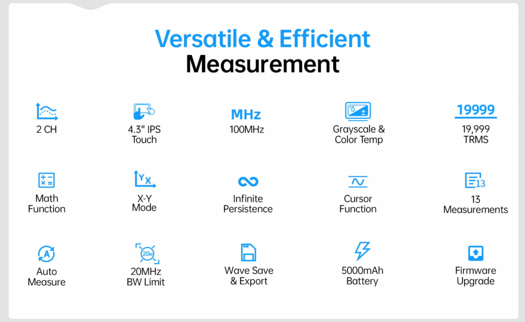 - Cursor Function & 13 Auto Measurements — Quick and clear parameter analysis.