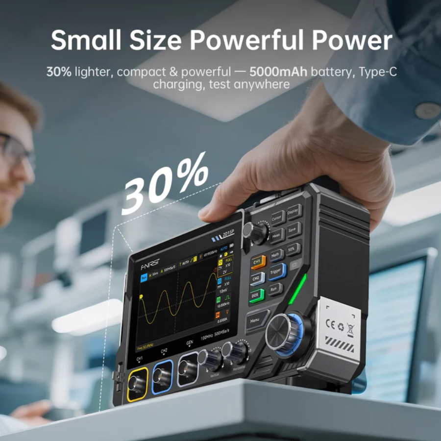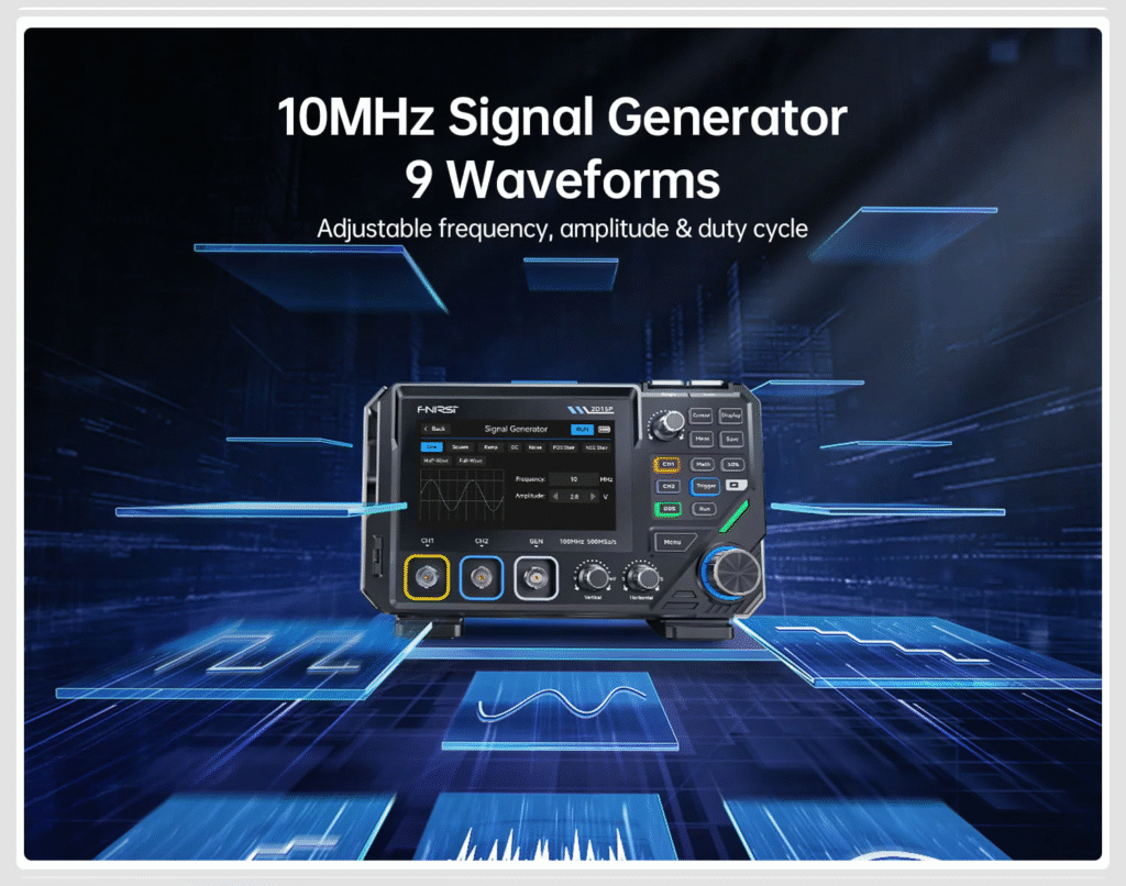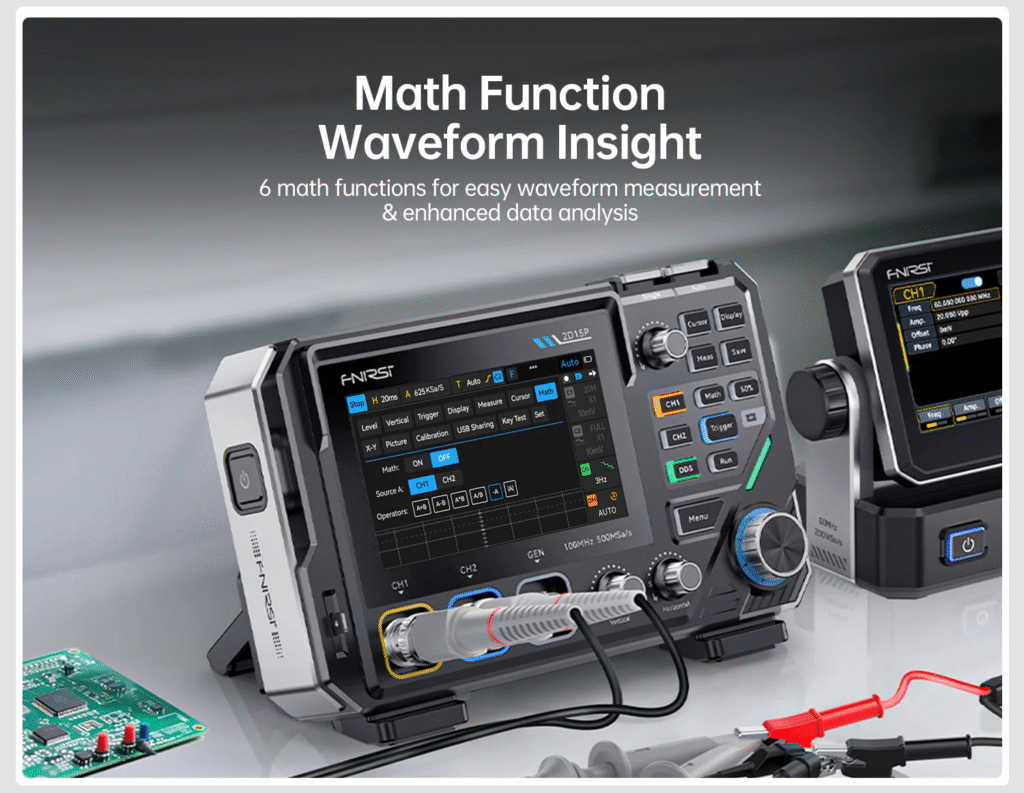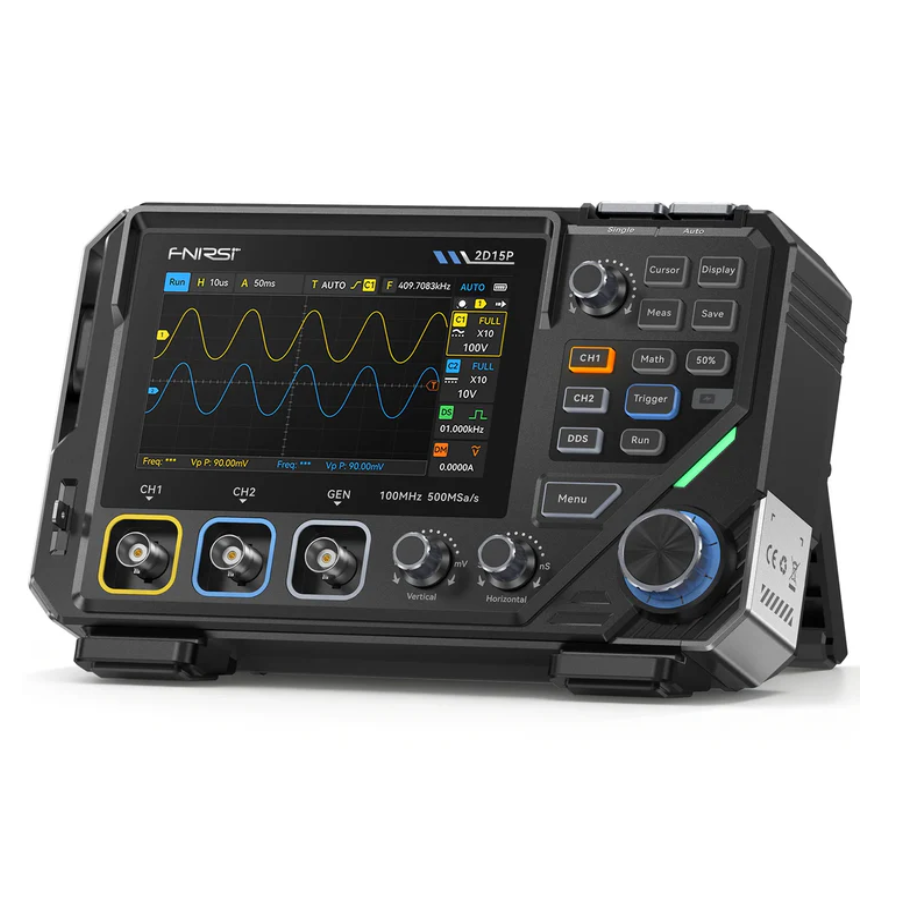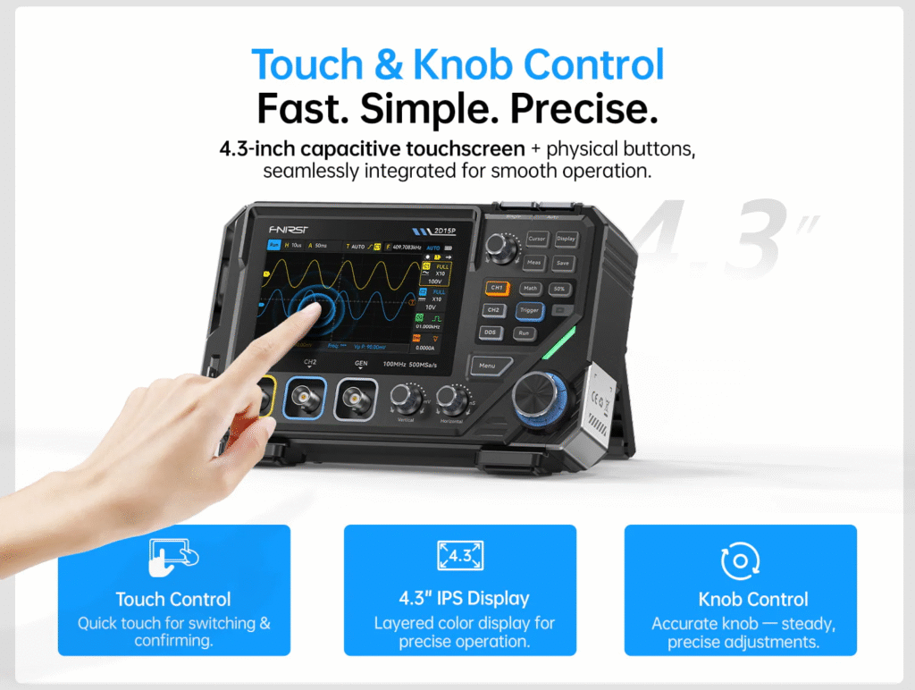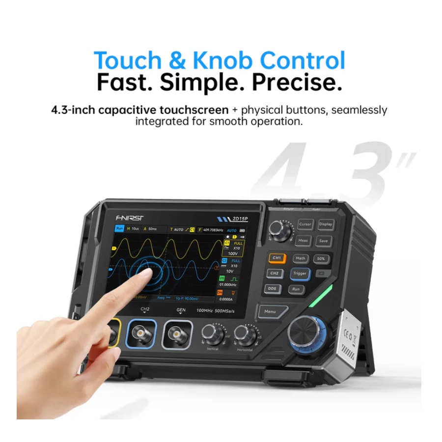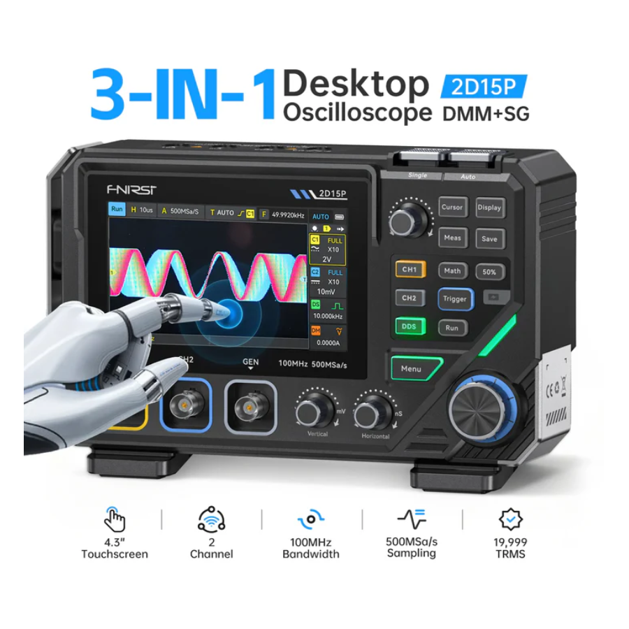 The FNIRSI 2D15P combines physical buttons with a 4.3″ capacitive touchscreen. It offers 500 MSa/s sampling, 100 MHz single-channel bandwidth (50 MHz dual-channel), and 10K–1M memory depth. Features include 128-level grayscale display, 1200 fps waveform capture, math functions, 18 automatic measurements, a 10 MHz waveform generator, and a 19999 Counts True RMS multimeter supporting voltage, current, resistance, capacitance, diode, and continuity tests.
