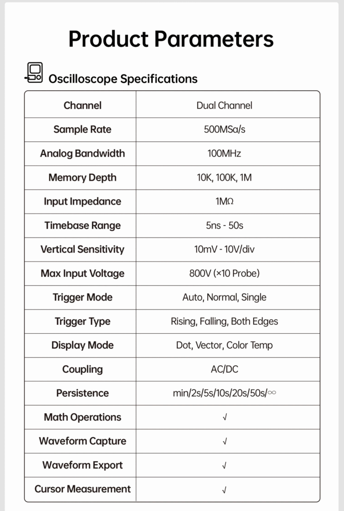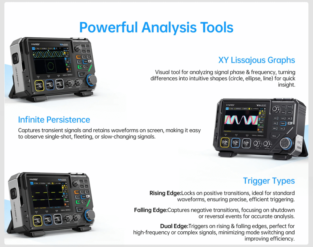 - Auto / Normal / Single Trigger Modes — Flexible signal capture for every testing need.