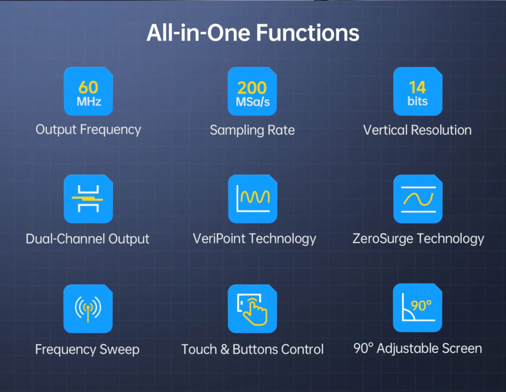 - 200 MSa/s sampling rate with 14-bit vertical resolution ensures high-fidelity waveform reproduction and minimal distortion.