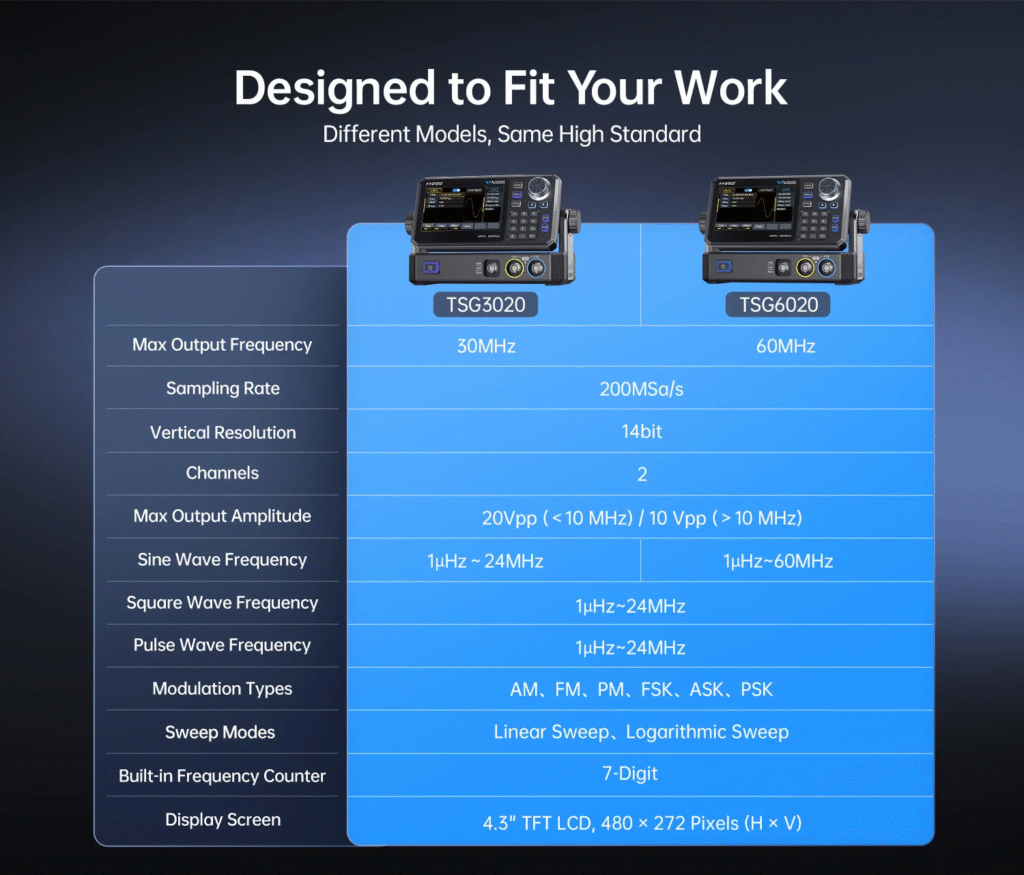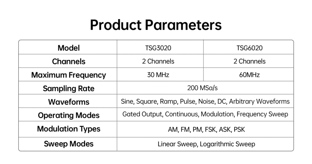 The TSG3020 and TSG6020 are dual-channel function/arbitrary waveform generators featuring DDS technology, 200 MSa/s sampling rate, and 14-bit resolution. The TSG3020 supports up to 30 MHz output frequency, while the TSG6020 extends to 60 MHz—both providing flexible and accurate amplitude control over waveforms, duty cycle, and edge timing. Ideal for R&D, education, and automated testing.